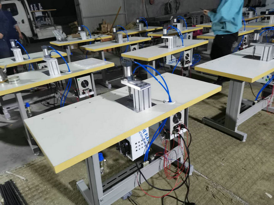 本機以超聲波將綁帶融合于口罩本體兩側(cè),進而完成綁帶式口罩成品,只需一名操作員將口罩片置于超聲波發(fā)生器的頭上,后將綁帶放在口罩片上,腳踏踏板使氣缸向下運動,縫住綁帶和口罩片。